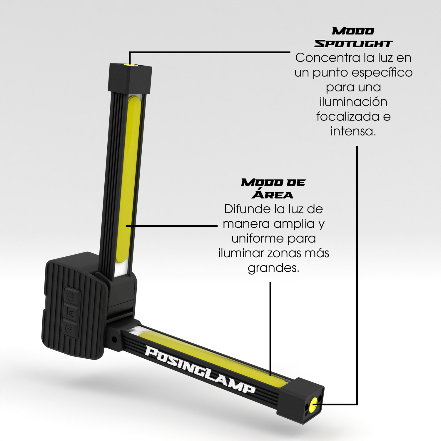 Con su potente base magnética, la PosingLamp se acopla fácilmente a cualquier equipo de gimnasio, permitiéndote orientar la luz desde cualquier ángulo. Ilumina cada pose y cada ángulo sin límites.